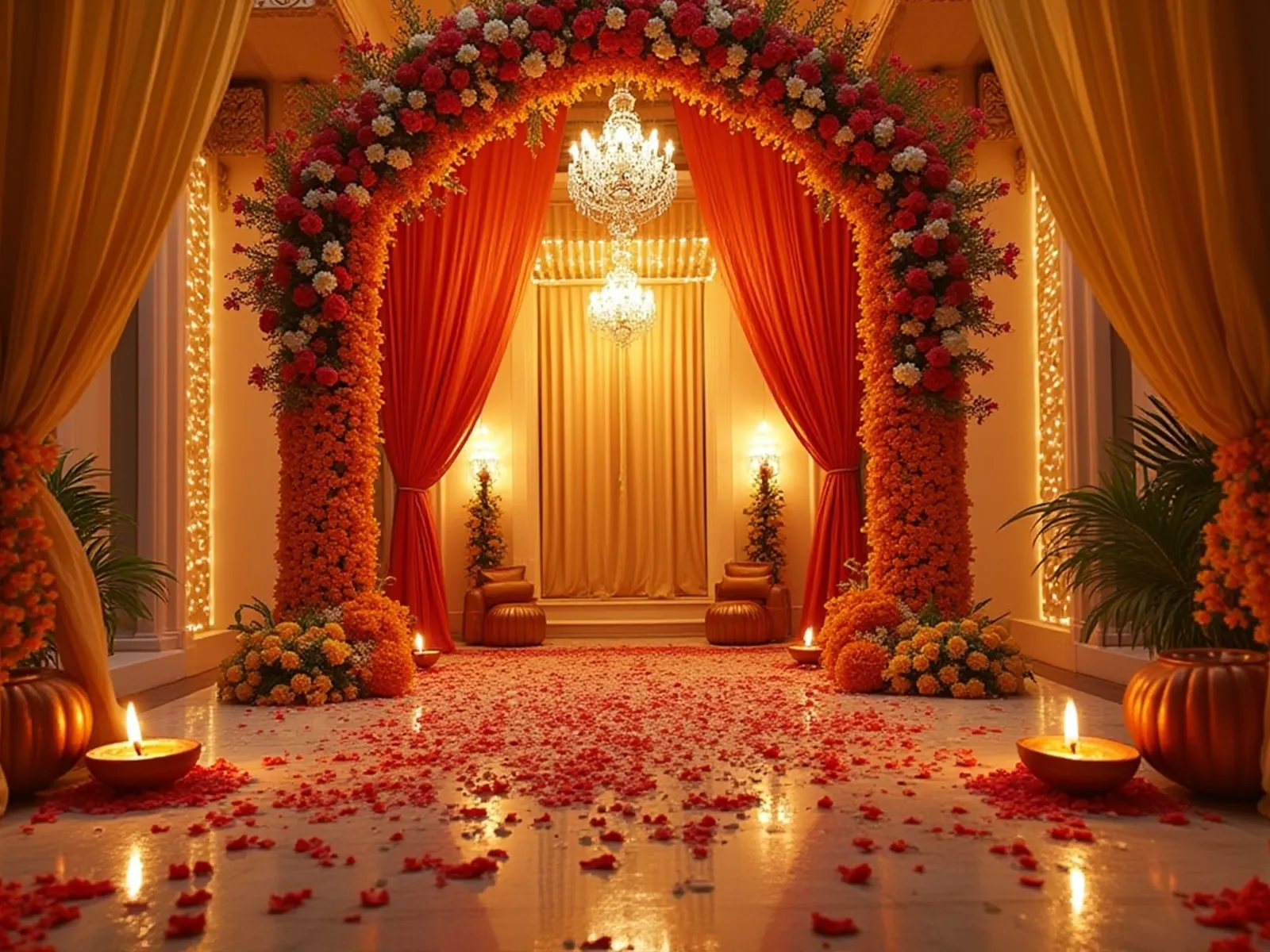 Welcome guests with a stunning arch made of orchids, roses, or marigolds. It creates a lasting first impression.