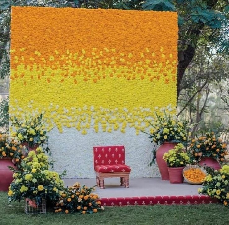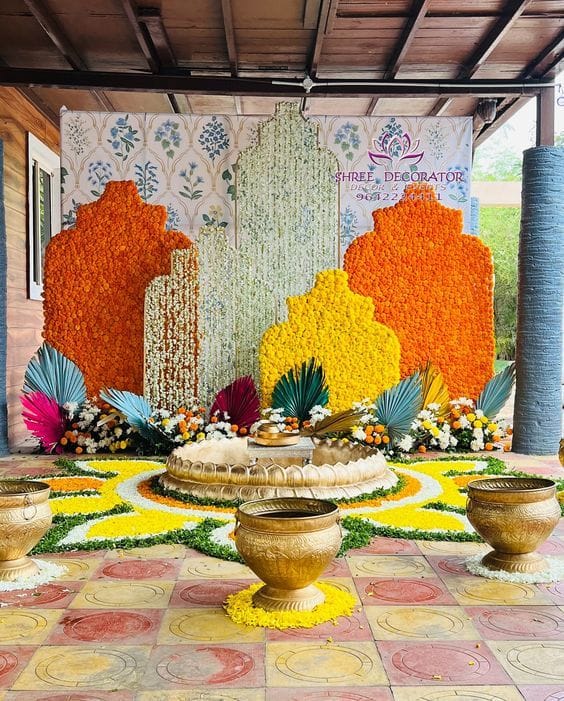 Haldi décor focuses on bright, cheerful, and traditional flower arrangements for the bride and groom’s pre-wedding ritual. Yellow, orange, and white flowers are widely used to match the festive vibe, along with quirky props and backdrops.