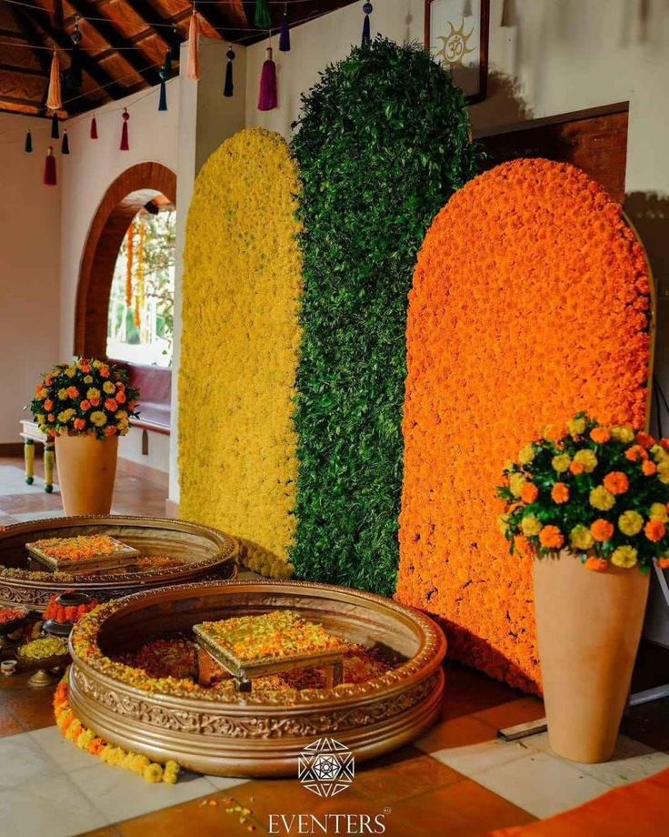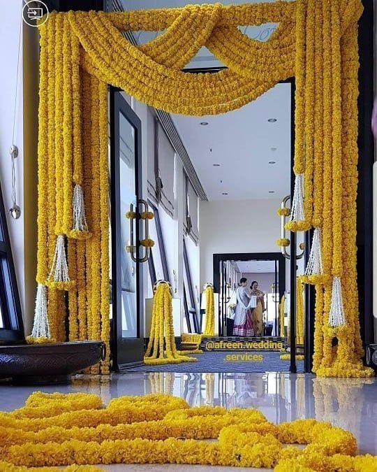 Marigolds, roses, jasmine, and orchids are perfect for Haldi décor.