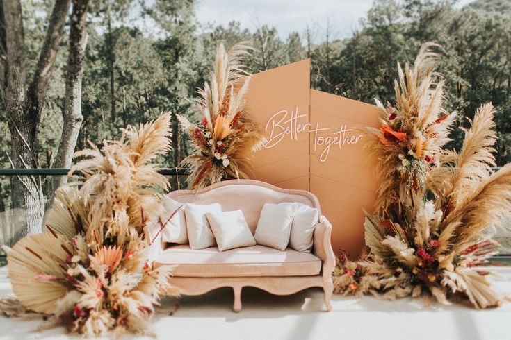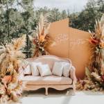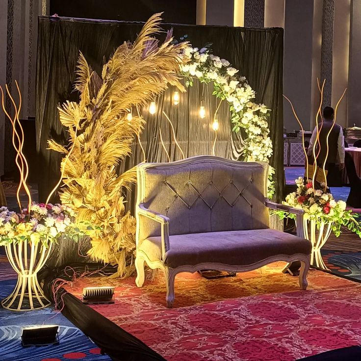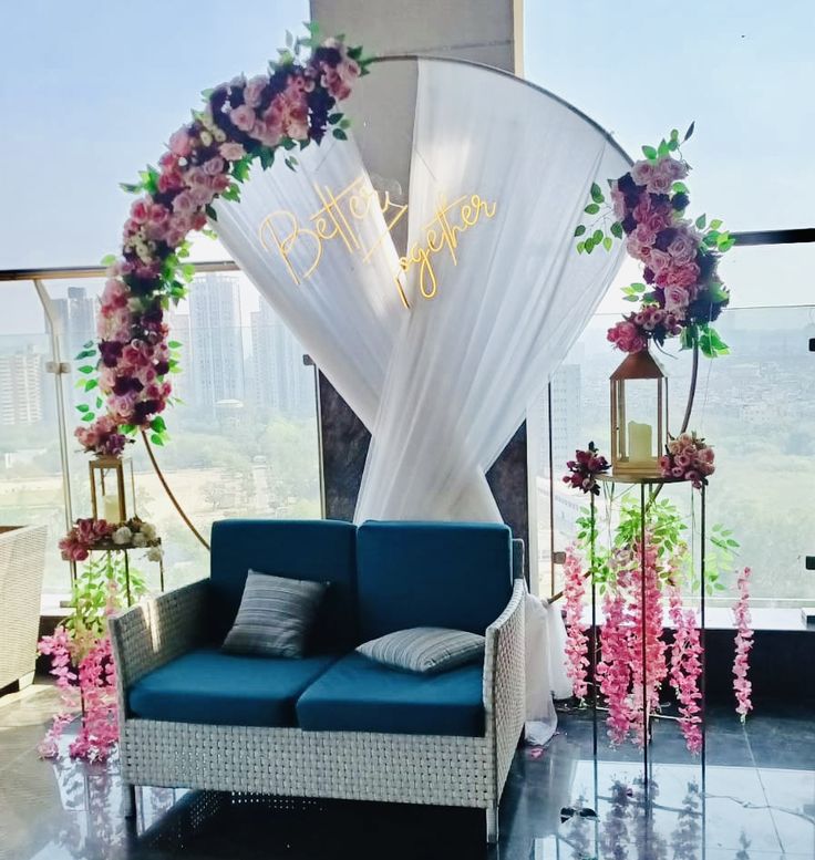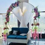Couple Seating Area – Decorated sofa setups with fresh flowers.